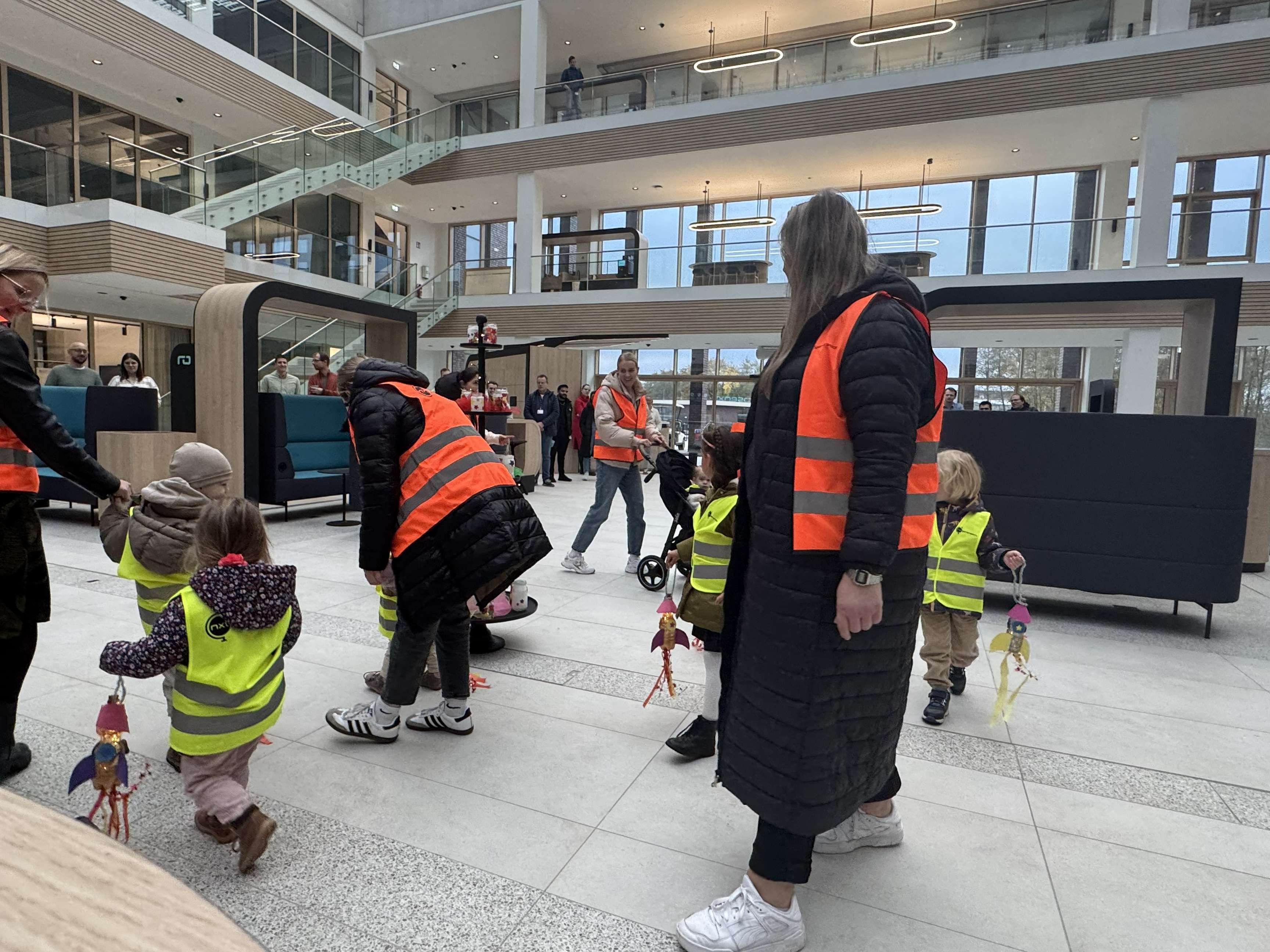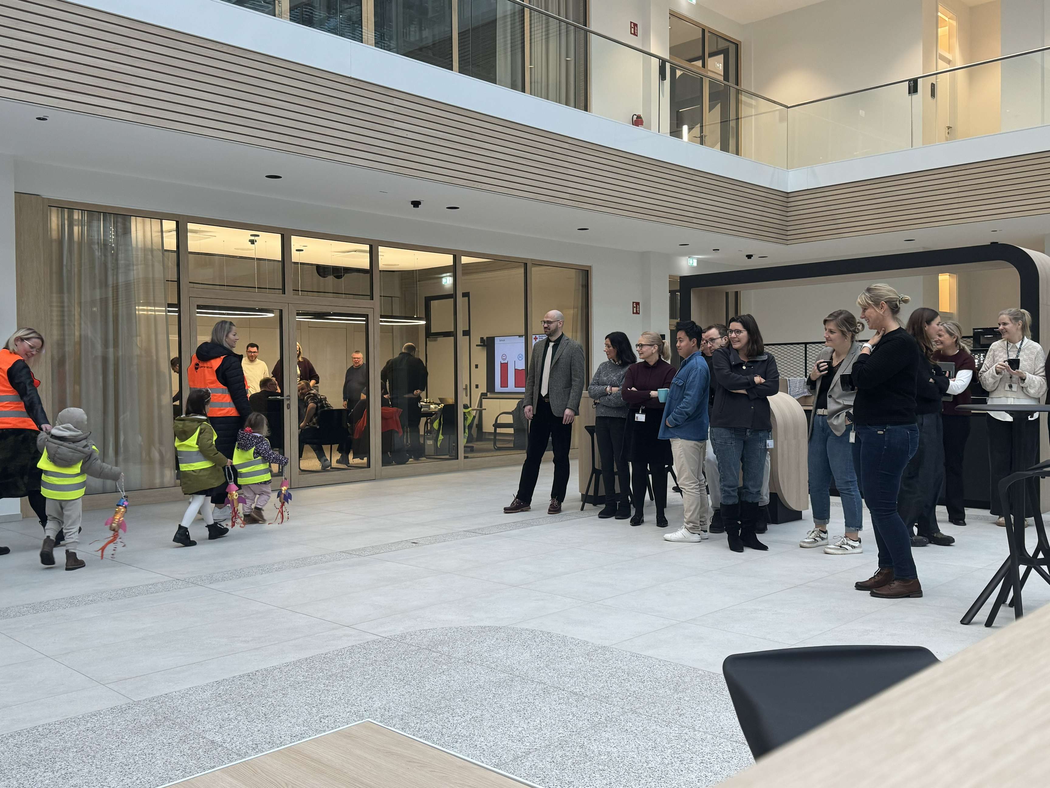 Dort stellten sich die Kinder im Kreis auf und sangen mehrere fröhliche Laternenlieder auf Deutsch und Englisch, die das Atrium in eine warme, festliche Stimmung tauchten. Mehr als 50 Mitarbeitende von Rosenxt ließen es sich nicht nehmen, die kleinen Sängerinnen und Sänger zu begleiten und den leuchtenden Moment gemeinsam zu erleben. Für die kleinen Teilnehmerinnen und Teilnehmer gab es im Anschluss neben einem großen Applaus der Anwesenden noch eine süße Überraschung. So wurde das Atrium von Rosenxt an diesem Morgen zu einem Ort voller Licht, Musik und gemeinsamer Freude.